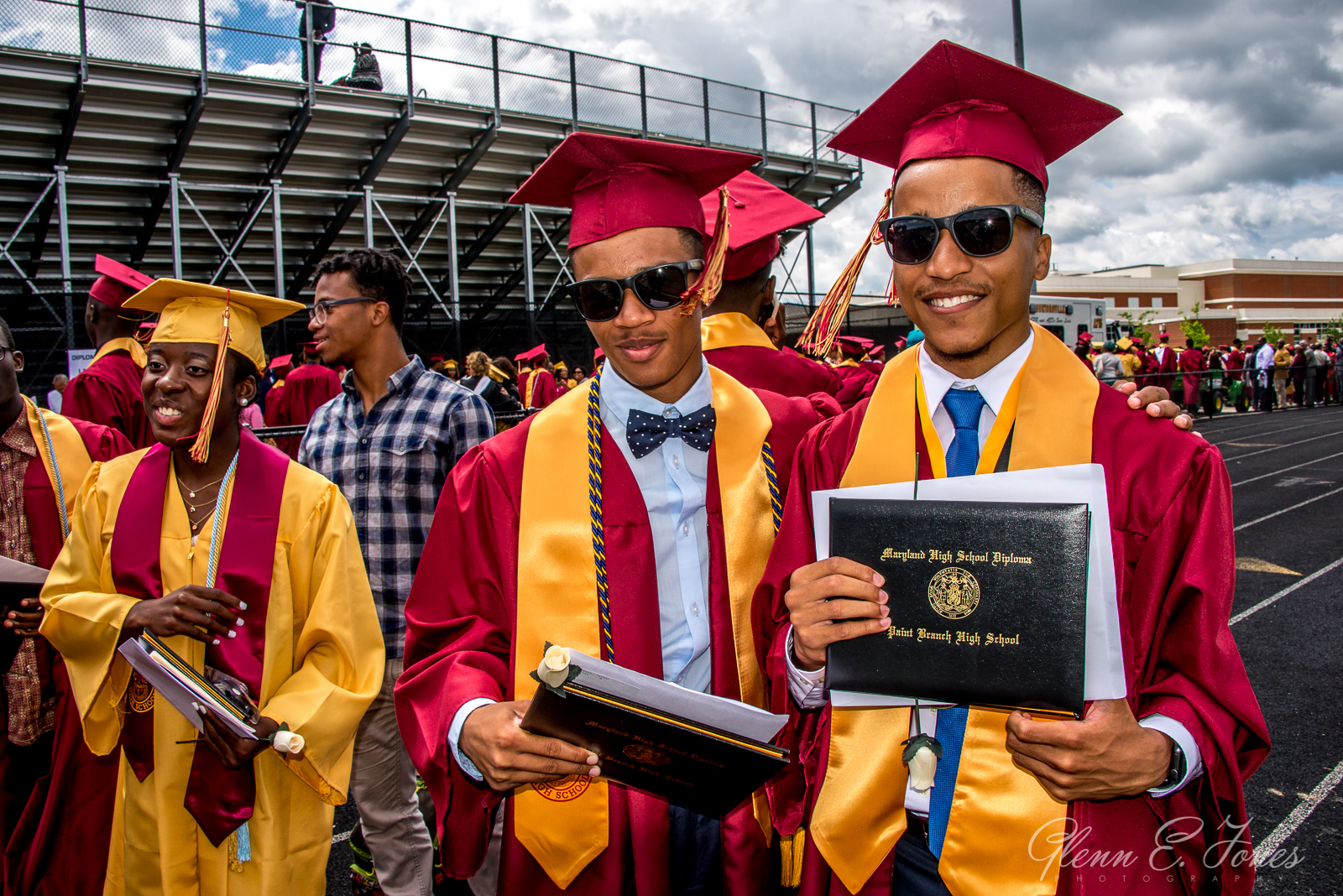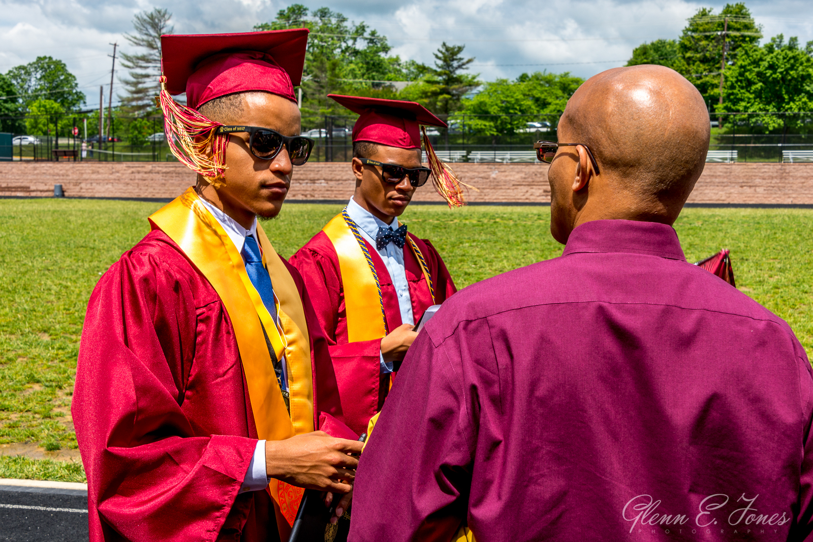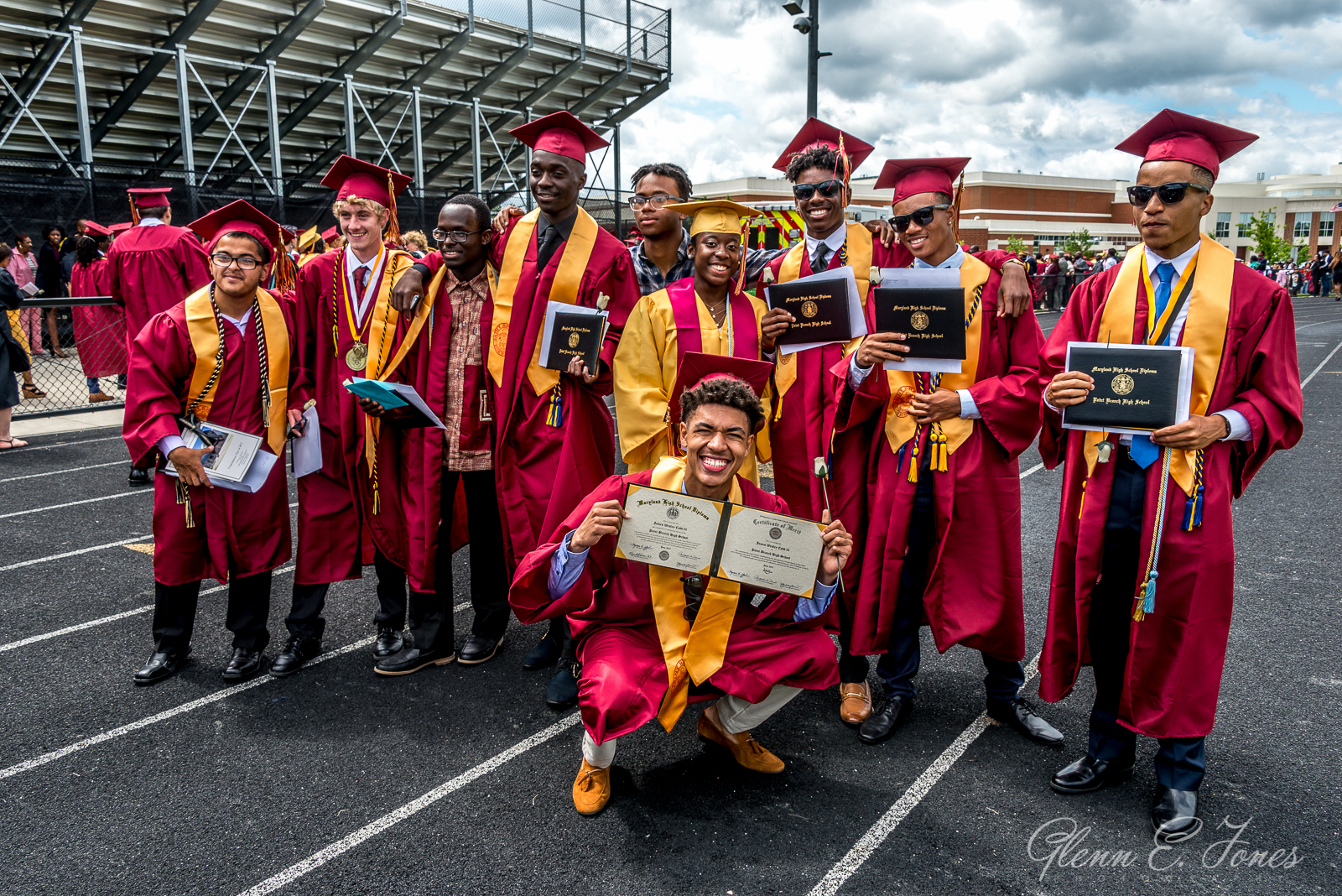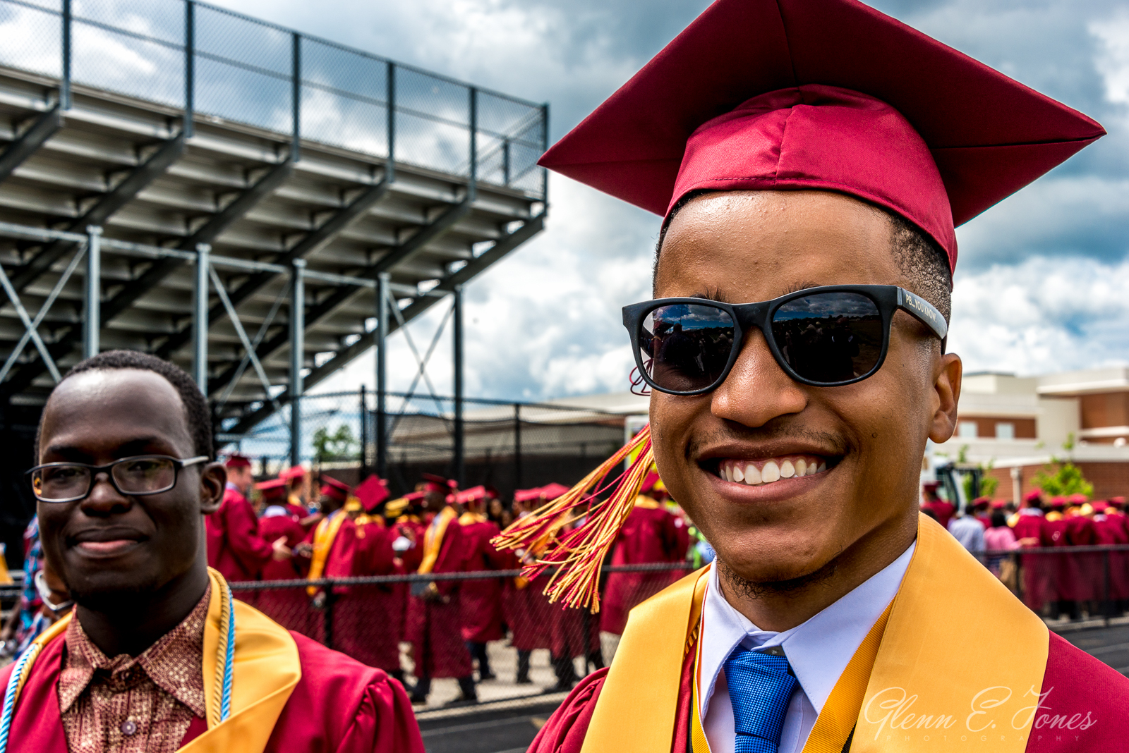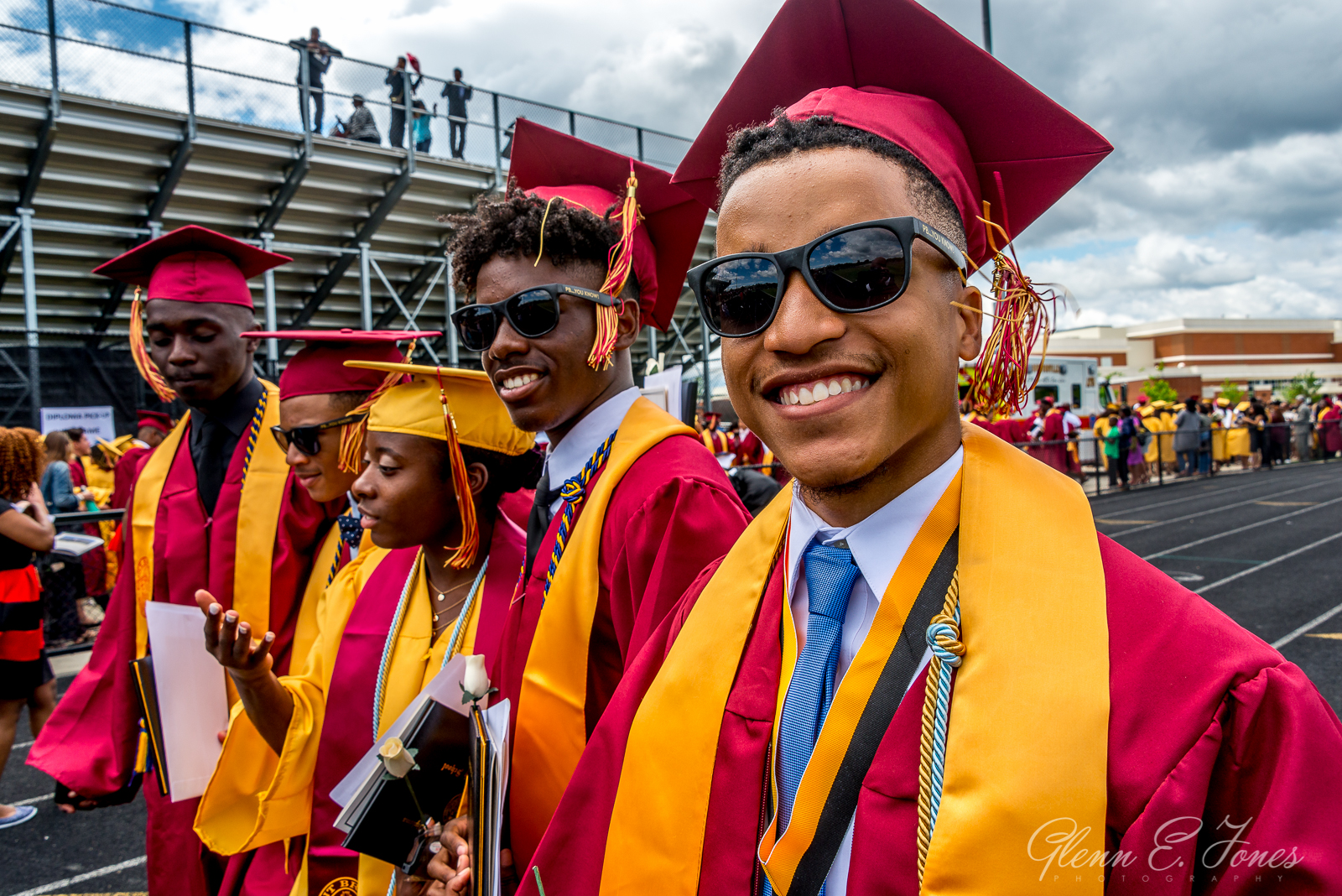 The rest of the program moved along in a blur and finally they marched out. One chapter of his life closed, well almost. He had a state track meet the next day. As the stream of graduates passed behind the stadium, I wandered in searching for Glenn. Finding him, Glenn stood proudly with friends wearing sunglasses and posing for photos. I took dozens of shots here, as friends and families stopped to document this amazing moment in history.