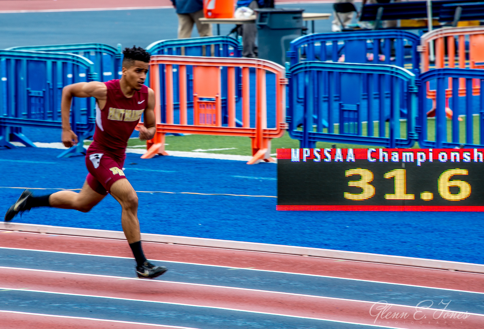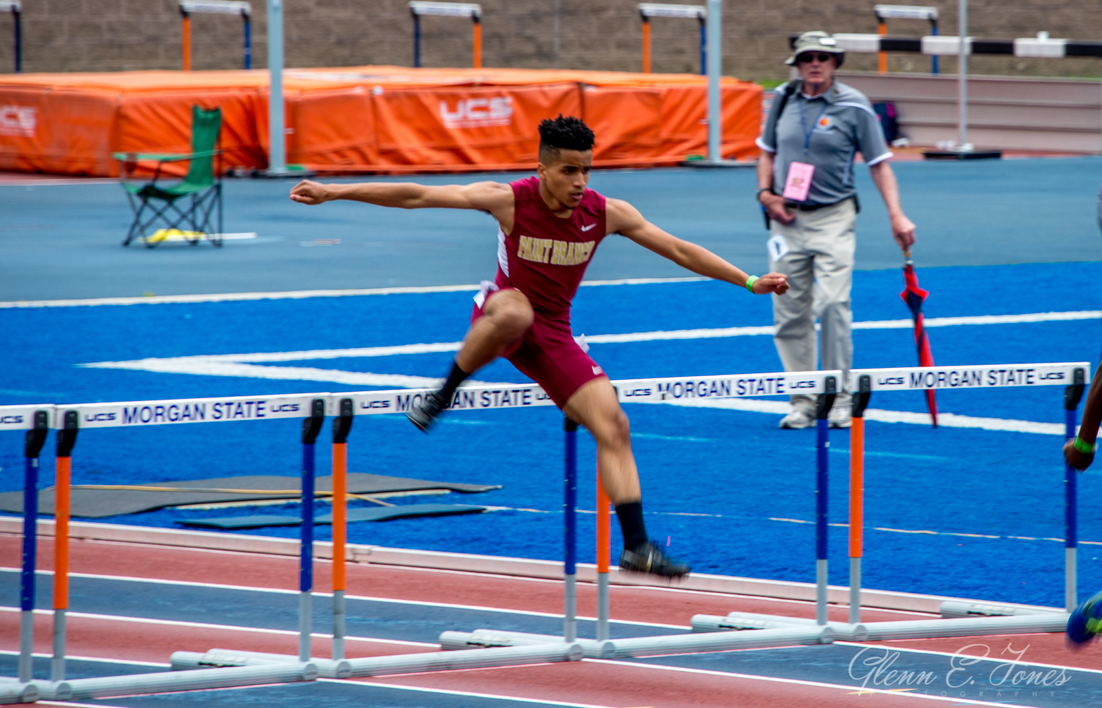 The event was packed (which was no surprise) and upon entering I heard the last call announcement for the 300m hurdles. Groups 1a, 2a, 3a and 4a (men and women) would race, meaning I had at least a 45 minute wait to see Glenn. About this time, it began raining. It was a slow chilling drizzle, which is pretty common on the east coast. About 5 minutes before his race, the rain began to fizzle out. I got closer to the track to watch his race. I heard the announcer say, “Paint Branch, lane 5” The gun sounded and they were off. I captured about 10 shots of him running. The race ended and so was his scholastic career as a runner. He sent me a text, saying he was ready to go home. And, 20 minutes later we were in the car heading south on I-95.